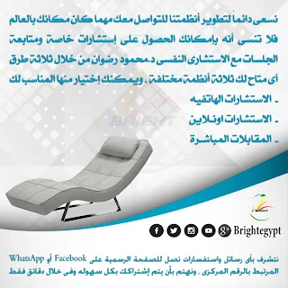 نسعى دائماً لتطوير أنظمتنا للتواصل معك مهما كان مكانك بالعالم فلا تنسى أنه بإمكانك الحصول على إستشارات خاصة ومتابعة الجلسات مع الاستشارى النفسى د.محمود رضوان من خلال ثلاثة طرق ، آى أنه متاح لك ثلاثة أنظمة مختلفة ، ويمكنك إختيار منها المناسب لك